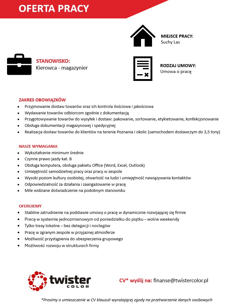 Osoby zainteresowane prosimy o przesłanie CV na adres mailowy: finanse@twistercolor.pl